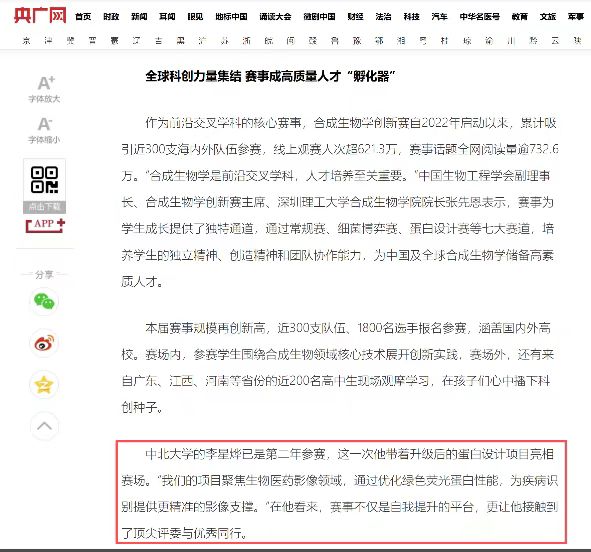 赛后,我校NUC-CHINA团队队长李星烨同学因项目的创新性与实践价值,接受了央广网、广东卫视、深圳卫视等主流媒体及行业公众号采访。他详细分享了项目从构思到实践的全过程,介绍团队在优化绿色荧光蛋白性能、为生物医药影像领域提供更精准疾病识别支撑等方面的技术突破,还畅谈参赛收获:“整个过程由团队自主设计完成,既锻炼了组织协调能力,更通过与行业顶尖评委、优秀同行交流,接触到更高层次的知识,实现了进阶学习。”其话语中展现的新时代青年探索精神,为学校赢得良好社会声誉。