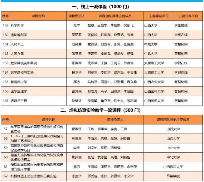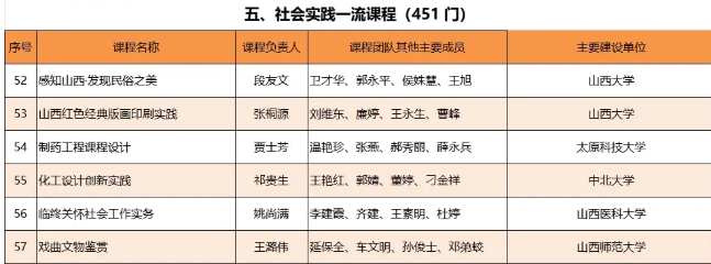 8月21日,教育部发布了《关于第三批国家级一流本科课程认定结果的公示》,认定5999门课程为第三批国家级一流本科课程,其中,线上课程1000门,虚拟仿真实验教学课程500门,线下课程1842门,线上线下混合式课程2206门,社会实践课程451门。山西高校100门课程上榜,我校11门课程入选。其中,线上一流课程2门、虚拟仿真实验教学一流课程2门、线上线下混合式一流课程3门、线下一流课程3门、社会实践一流课程1门。