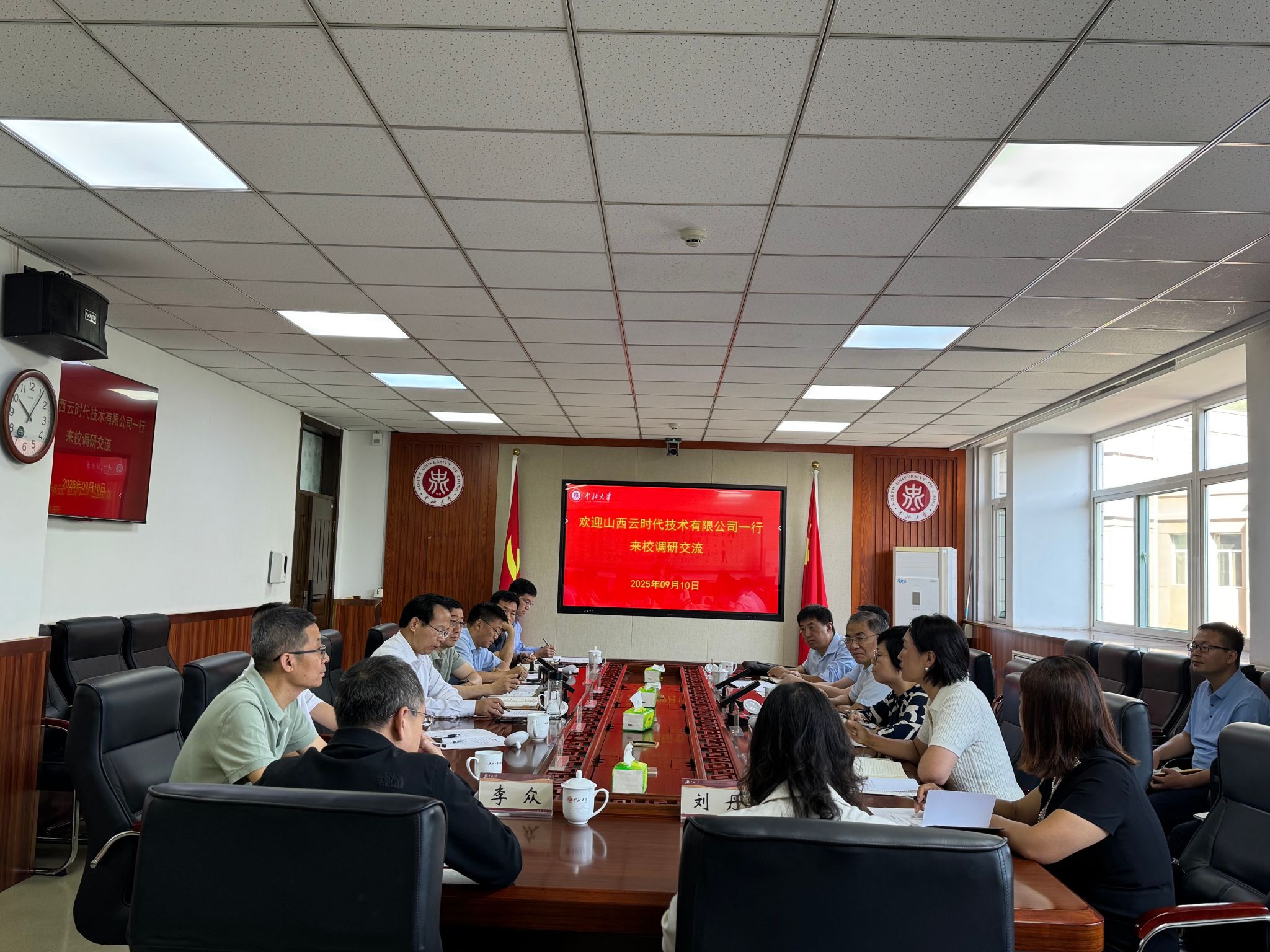 9 月 10 日,山西云时代技术有限公司党委书记、董事长阳军一行来校调研交流,双方交流座谈会在德怀楼第四会议室召开。校党委书记张晓永、副校长刘俊出席座谈会。学校数字纪检监察研究院、科学技术研究院、计算机科学与技术学院、人文社会科学学院等相关单位负责人参加座谈。刘俊主持会议。