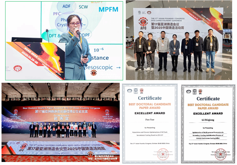 我校材料科学与工程学院教育部铝镁协同创新中心团队7名师生应邀参会。赵宇宏教授做了题为“相场与铸造软件自主研发与应用”的邀请报告,博士生李志强“S30432 连铸方坯二冷凝固过程多工艺参数优化”、潘玥“铝合金油箱熔模铸造充型过程数值模拟”在亚洲科技青年论坛中荣获最佳博士生论文优秀奖,相关成果引发与会专家广泛关注与高度评价,彰显了团队在铸造领域学术实力与创新水平。