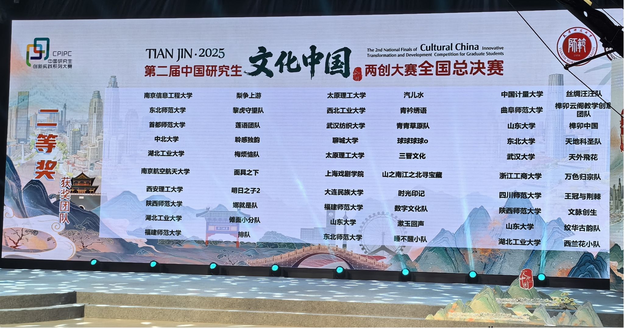 12月7日,第二届中国研究生“文化中国”两创大赛全国总决赛在天津师范大学落下帷幕。我校22支研究生参赛队伍在全国角逐中表现亮眼,最终斩获全国二等奖1项、全国三等奖1项。