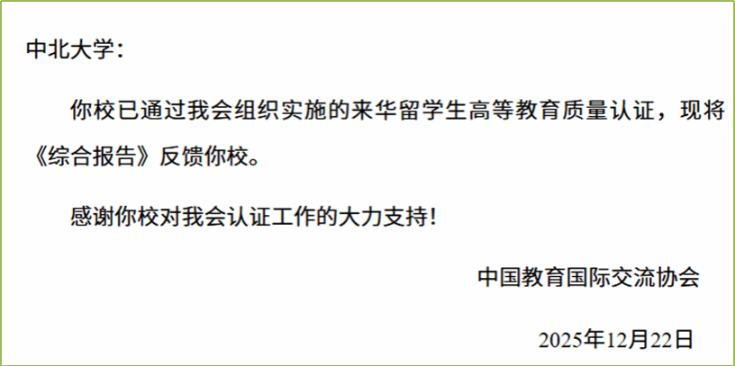 山西省教育厅副厅长李金碧指出,中北大学作为全省重点支持创建“双一流”的高校,此次顺利通过认证,不仅是学校国际化发展的重要里程碑,更为“留学山西”品牌建设提供了坚实支撑。