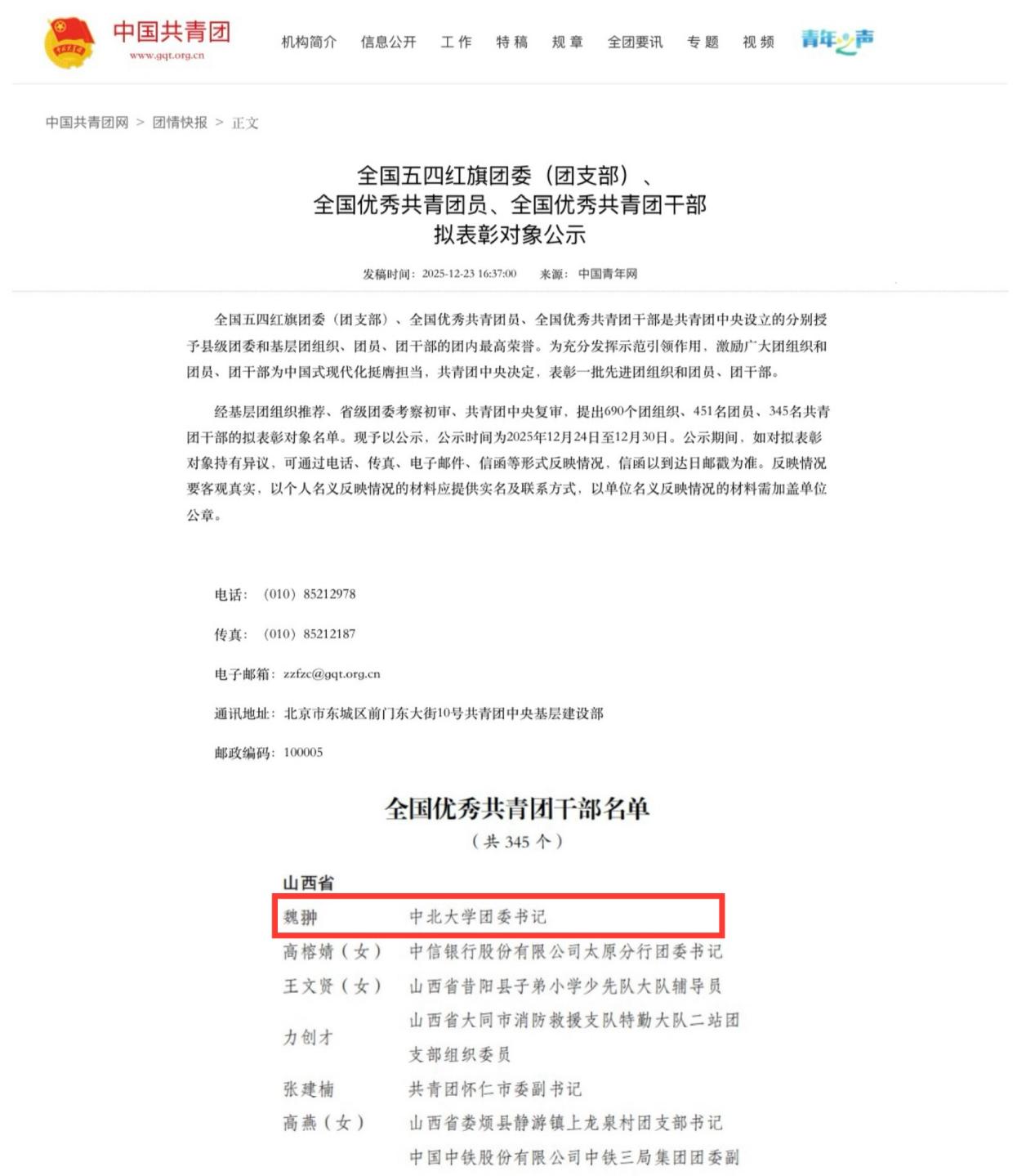 近日,共青团中央对全国五四红旗团委(团支部)、全国优秀共青团员、全国优秀共青团干部拟表彰对象进行公示,我校团委书记魏翀同志凭借扎实的工作作风、突出的工作成效,荣获“全国优秀共青团干部”荣誉称号。这一荣誉是共青团中央对我校共青团工作的高度认可,也是对魏翀同志个人履职尽责、担当作为的充分肯定。