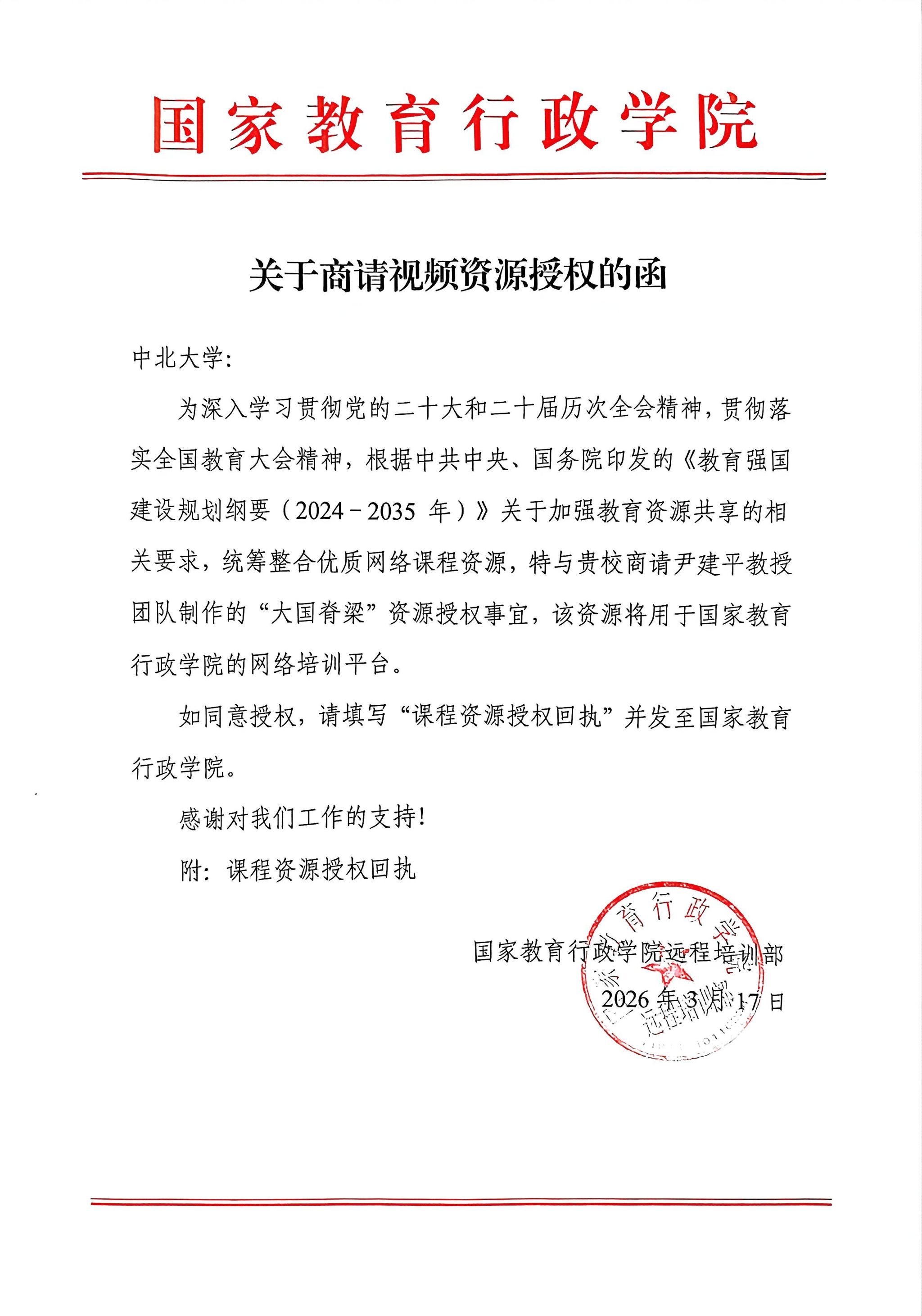 近日,我校收到国家教育行政学院来函,商请引入我校尹建平教授团队制作的《大国脊梁》精品课程资源,用于国家教育行政学院的网络培训平台,这是我校教学资源首次入选国家教育行政学院优质网络课程资源,凸显了我校“课程思政”建设的新成效。