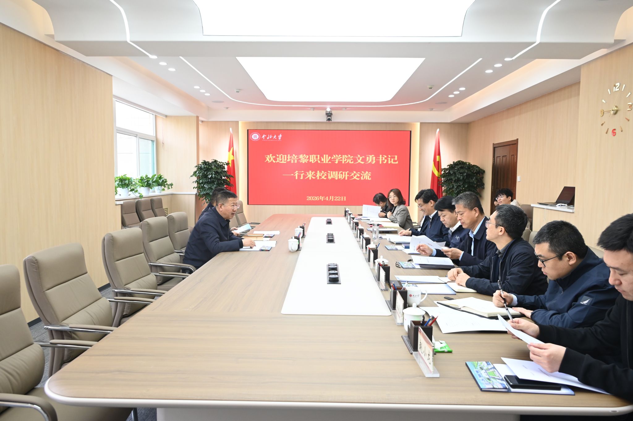 4月22日,培黎职业学院党委书记文勇、办公室主任赵锋一行来校调研交流。双方交流座谈会在德怀楼第四会议室召开。我校副校长来志斌出席。