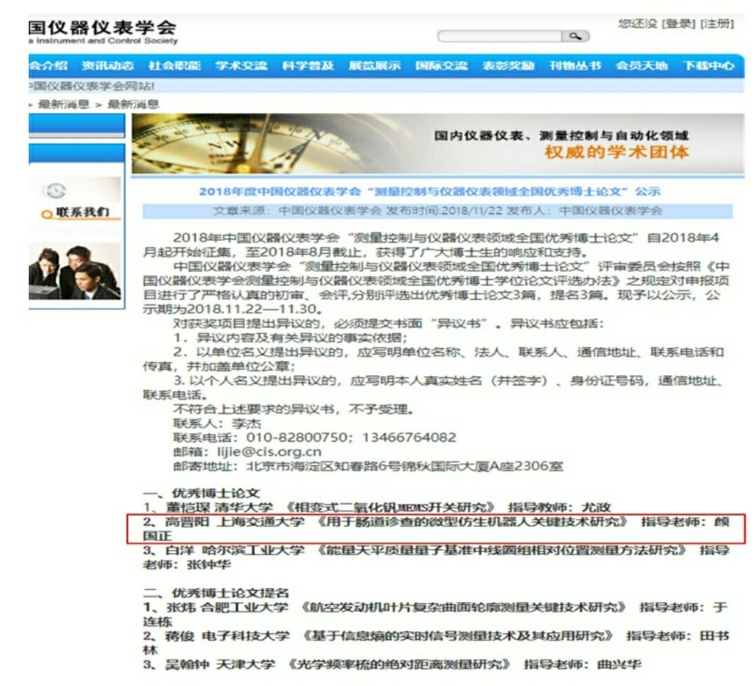 日前,2018年度中国仪器仪表学会测量控制与仪器仪表领域全国优秀博士学位论文评选结果揭晓,经过严格初审、会评,共评选出3篇优秀博士学位论文,我校仪器与电子学院青年教师高晋阳的博士学位论文《用于肠道诊查的微型仿生机器人关键技术研究》获此殊荣。