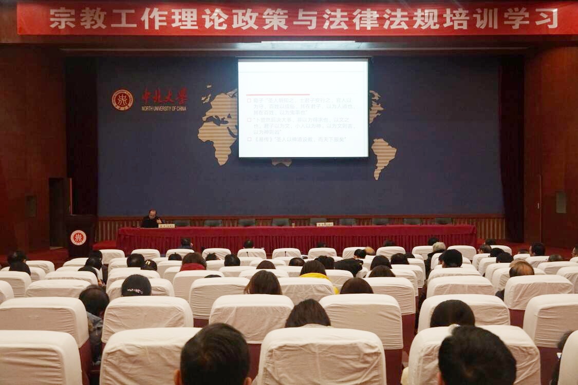 1月4日,为进一步贯彻落实习近平总书记关于宗教工作的重要讲话精神,确保做好学校宗教工作,我校在图书馆五层报告厅开展宗教工作理论政策与法律法规培训。省委统战部宗教处处长黄杰应邀作题为"坚持我国宗教中国化方向是新时代宗教工作的根本指引"的报告。全体校领导,学校党委委员,基层党委(党总支、直附属党支部)委员,辅导员,两课教师,国际交流合作处和教务处负责人等参加了此次培训学习。校党委副书记薛智主持讲座。
