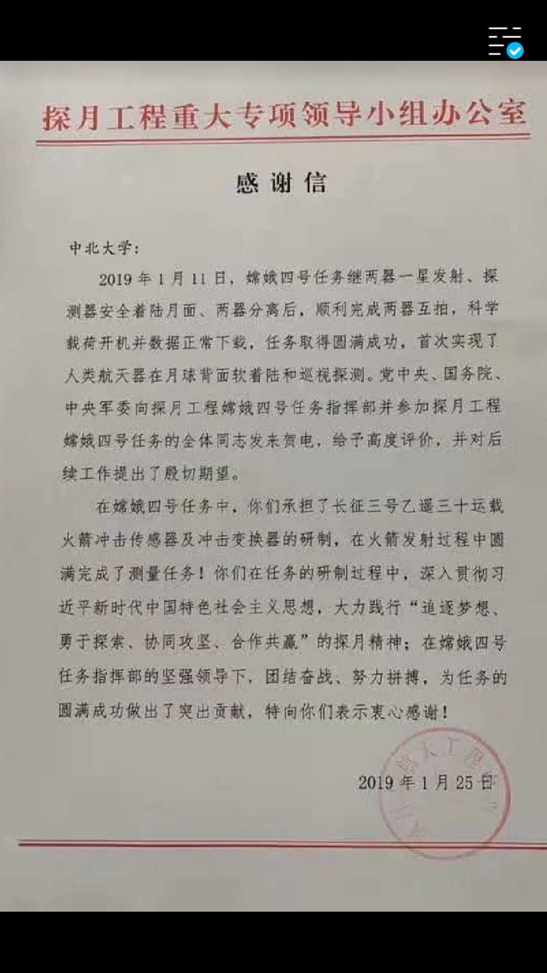 在嫦娥四号任务中, 你们承担了长征三号乙遥三十运载火箭冲击传感器及冲击变换器的研制,在火箭发射过程中圆满完成了测量任务!你们在任务的研制过程中,深入贯彻习近平新时代中国特色社会主义思想,大力践行“追逐梦想、勇于探索、协同攻坚、合作共赢”的探月精神;在嫦娥四号任务指挥部的坚强领导下,团结奋战、努力拼搏,为任务的圆满成功做出了突出贡献,特向你们表示衷心感谢!