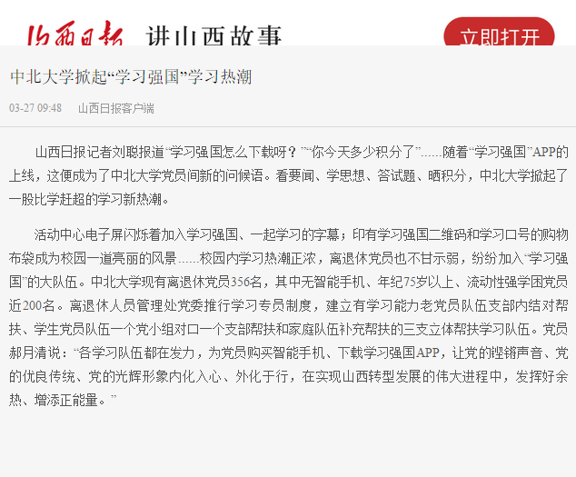 3月27日,山西日报客户端报道了我校“学习强国”学习平台推广工作。全文如下: