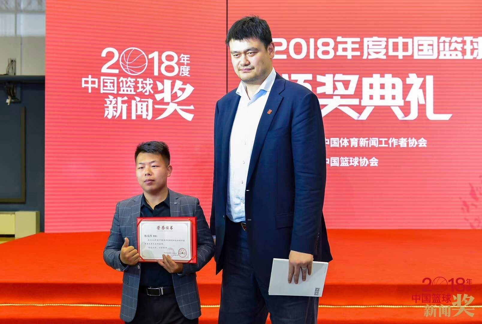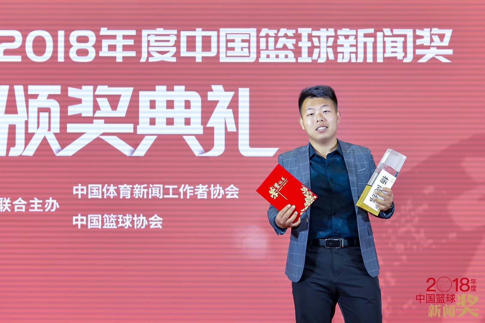 4月24日下午,2018年度中国篮球新闻奖颁奖典礼在国家体育总局训练局篮球馆举行。中国体育新闻工作者协会、中国篮球协会、中国篮球协会新闻委员会、国家队领导和嘉宾以及来自全国各地近百名新闻工作者和媒体人汇聚北京,参加这一专属于篮球人的盛会。我校体育学院研究生、篮球解说杨尚纬受邀出席颁奖典礼,他的视频作品《一场特殊的慈善赛帮助患重症的孩子 圆了篮球梦》荣获年度优秀大众作品奖,中国篮协主席姚明为其颁奖。他也是此次唯一以在校学生身份获奖的媒体人。