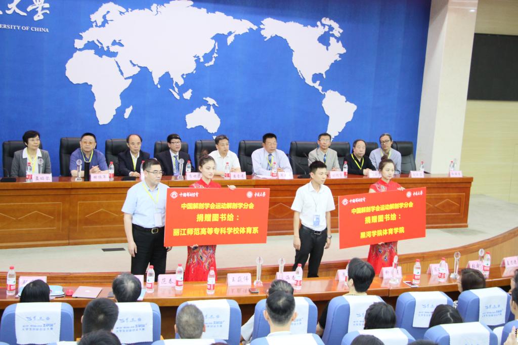 成立大会上,运动解剖学分会向边疆两所学校(黑河学院和丽江师范高等专科学校)体育学院捐赠了会员教师出版的教材和学术著作。