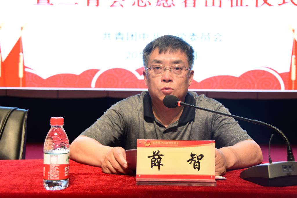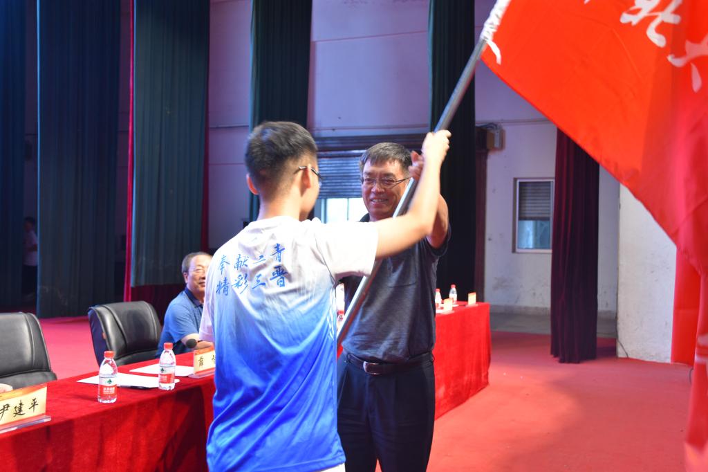 薛智为二青会志愿者代表授旗;与会部门负责人为暑期社会实践队代表授旗。