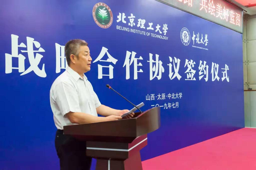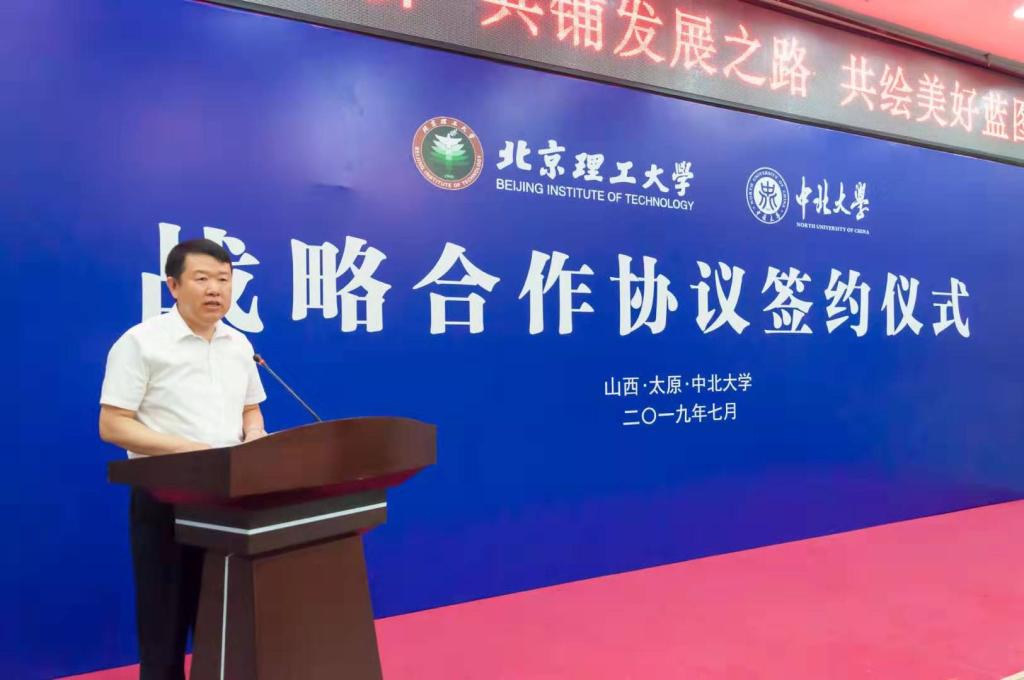 沈兴全在致辞中表示,北京理工大学与中北大学一脉相承、同根同源,从历史渊源、隶属关系、办学特色和服务面向等等方面,两校有着难以割舍的血脉亲情。七十多年来,两校同声相应、同气相求。迈入新时代,两校通过签署战略合作协议续写合作奋进的崭新篇章,这对双方来说是一个互惠共赢的全新起点;对我校来说是一个借力发展的难得机遇,我们定会倍加珍惜。在下一步的合作中,我校将依据协议精神积极建立健全工作联系沟通机制,指定专人负责,在学科建设、人才培养、科学研究、队伍建设等领域主动作为,力争尽早取得一批具有较大影响的合作成果。