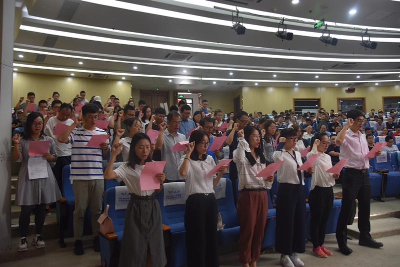 全体新入职教师在山西省“1331工程”立德树人建设计划高校教书育人“好老师”邵燕灵的带领下,庄严宣誓。