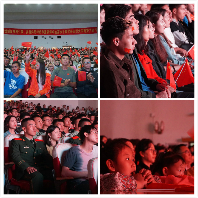 饱含深情、慷概激昂的旁白,英姿飒爽的受阅方队、先进强大的武器装备、充满历史记忆和特色活力的群众游行都持续点燃着现场师生的热情,科艺苑掌声不断,欢呼声激荡,小红旗飞舞,一片红色的海洋。