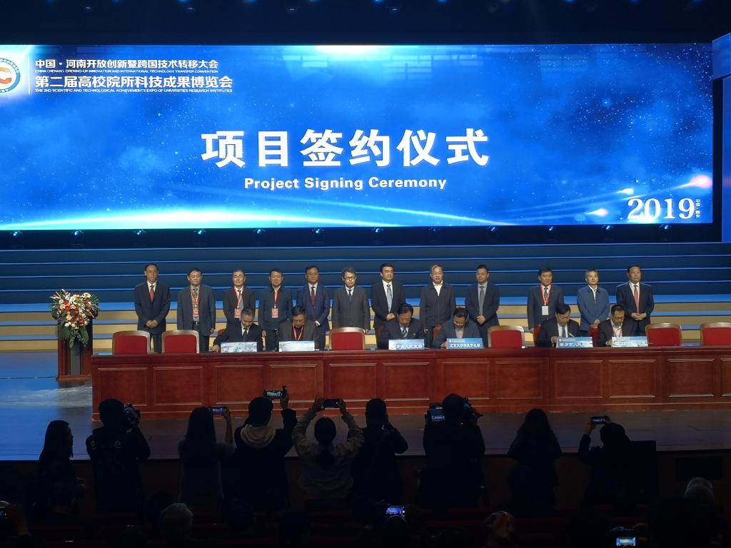 在“高博会”开幕式上,由沈兴全校长、新乡市委张国伟书记等见签,校党委副书记薛智代表我校与新乡市人民政府签订全面战略合作协议,此次高博会,我校共展出可转化科技成果15项,相关学院院长、中北新缘总经理亲自到场推介交流,取得丰硕成果。