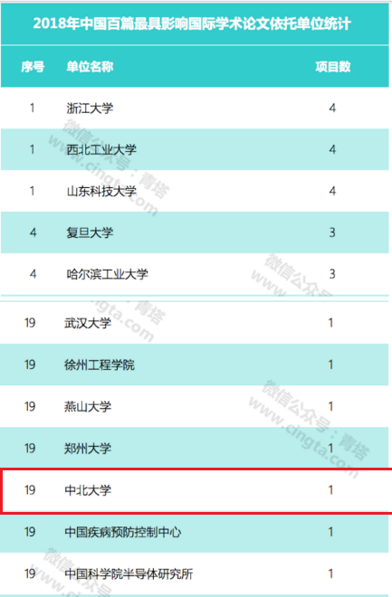据悉,本年度百篇最具影响国际学术论文是从2018年SCI收录的我国第一作者论文中选取,都来自2018年中国卓越国际科技论文,保证了论文的领先性和在学科中的相对优势。此次遴选出的100篇论文分布于24个学科,分属于75个机构,其中高等院校76篇,研究所14篇,高校附属医院和其他医院10篇。按完成单位统计,浙江大学、西北工业大学、山东科技大学各有4篇入选,位居第一位;复旦大学、哈尔滨工业大学、湖南大学、华北电力大学、四川大学、浙江师范大学各有3篇;北京大学、安徽工业大学等高校各有2篇;中北大学、北京理工大学等高校各有1篇。