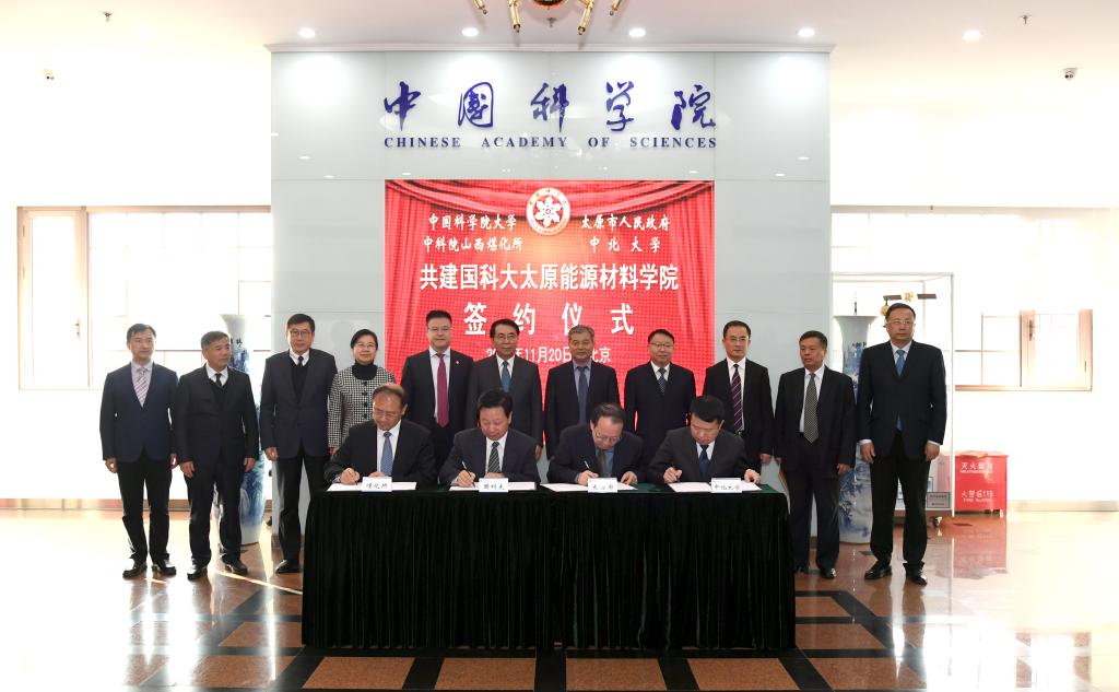 11月20日,中国科学院大学太原能源材料学院共建签约仪式在北京隆重举行。中科院院长、党组书记、国科大名誉校长白春礼,中科院副院长、国科大党委书记、校长李树深,山西省委常委、太原市委书记罗清宇,山西省政协副主席、太原市委副书记、市长李晓波,中科院山西煤炭化学研究所所长房倚天,我校党委书记李忠人、校长沈兴全、副校长曾建潮等出席签约仪式。签约仪式由国科大党委常务副书记、副校长董军社主持。