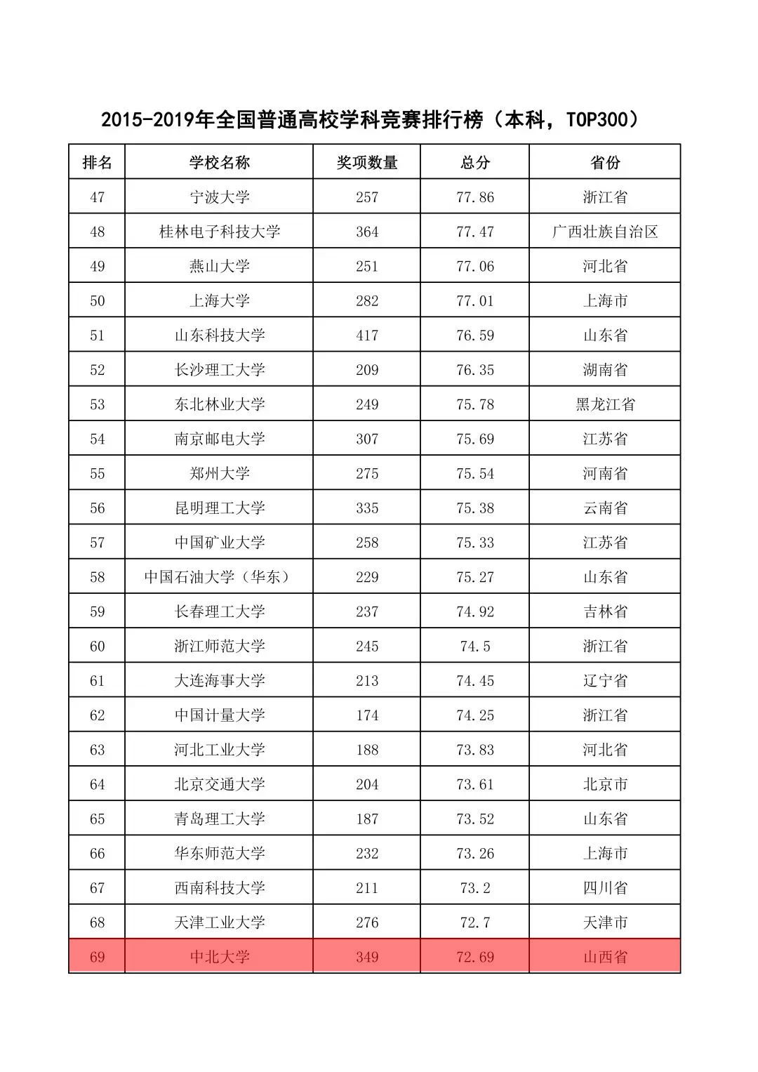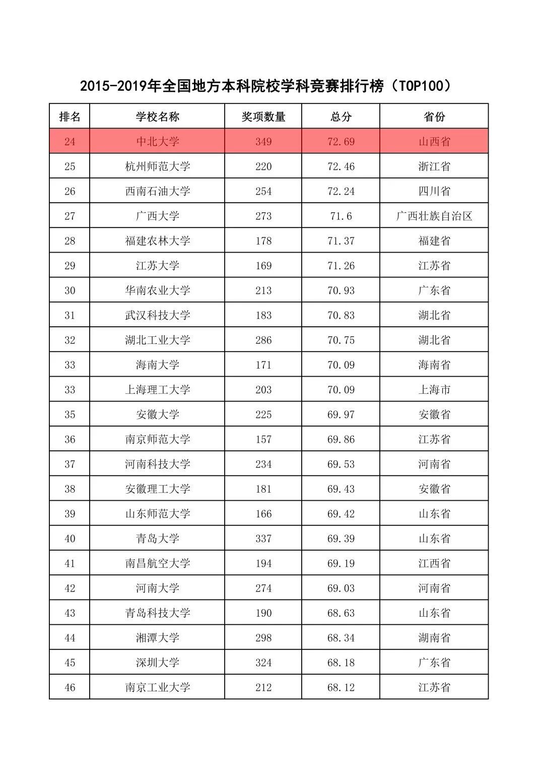 其中,在《2019全国普通高校学科竞赛排行榜》中,我校位列第43名(去年此项排名为100名),位居全省第一,获历史性新突破;在《2015-2019年全国普通高校学科竞赛排行榜》位列第69名(去年此项排名为86名),位居全省第二;同时,在首次推出的《2015-2019年全国地方本科院校学科竞赛排行榜》中位列第24名,位居全省第二!