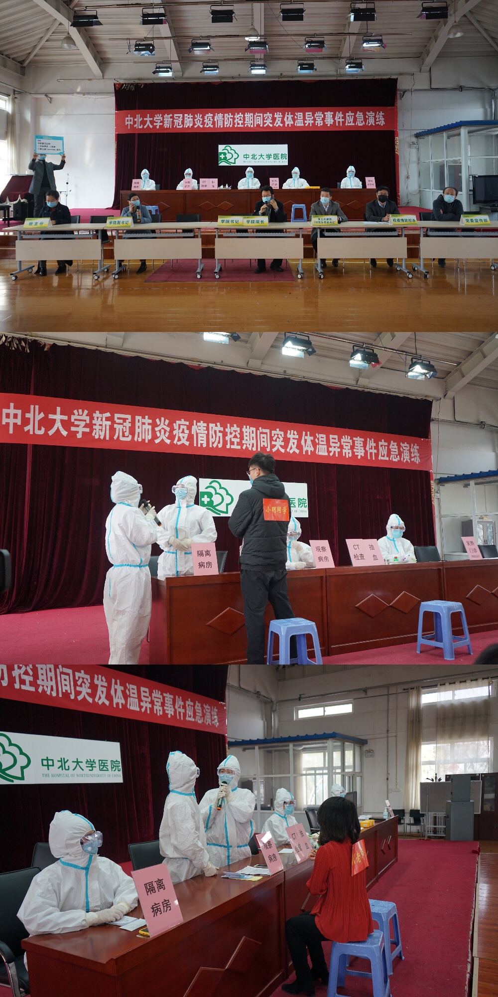 师生突发体温异常应急演练在老干部活动中心进行。演练分别模拟了学生在宿舍和老师在教研室突发体温异常情况的处置程序和应对方法。全程分为发现和报告、预检和分诊、确诊和善后三个阶段处置流程。发现体温异常后,学生第一时间上报班主任,由所在学院相关负责人联系校医院就诊,老师自己联系校医院前往就诊。就诊中,经校医院预检分诊、发热门诊诊断,若不能排除感染新冠肺炎可能,第一时间逐级上报并安排救护车送定点医院就诊,同时配合上级疾控部门开展密切接触人员名单调查、对相关场所进行消杀、对密切接触者进行隔离观察等相关工作。