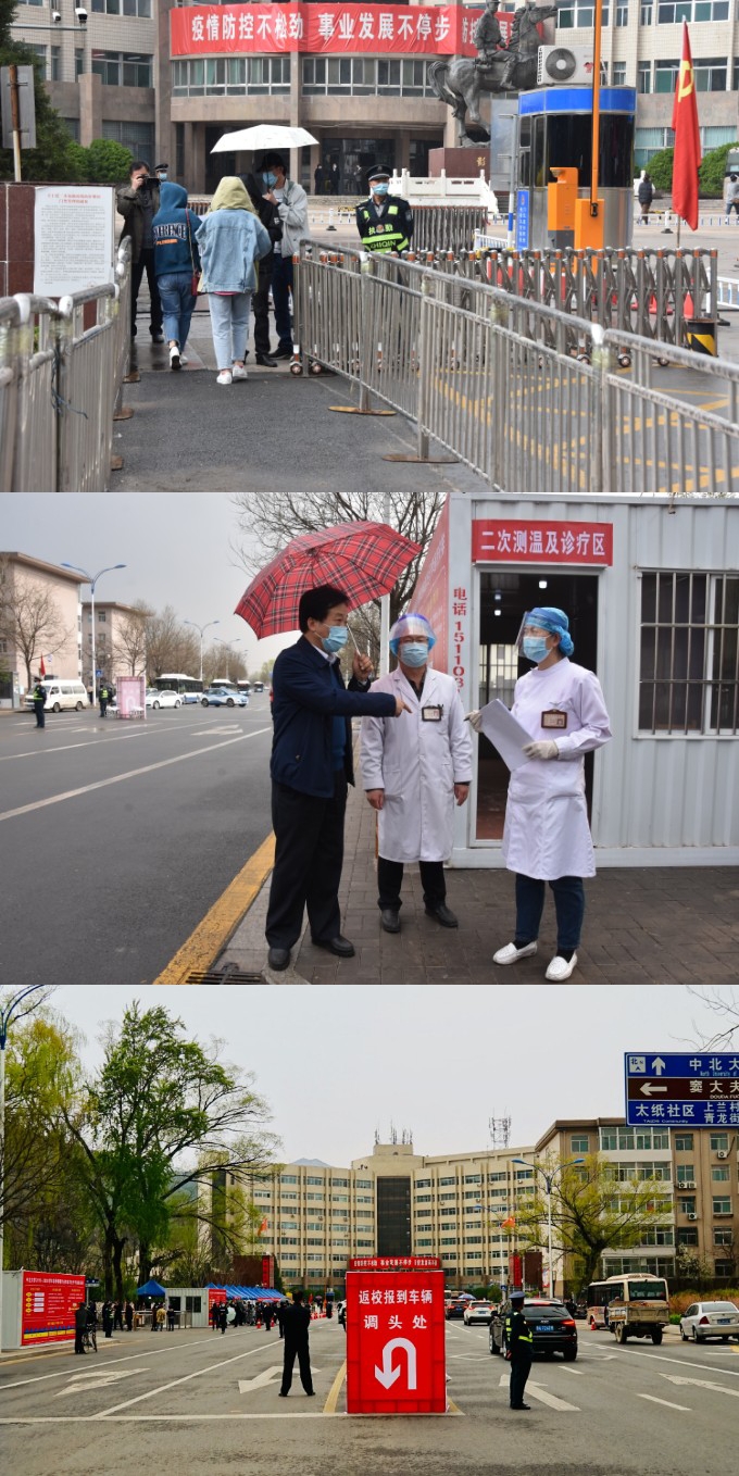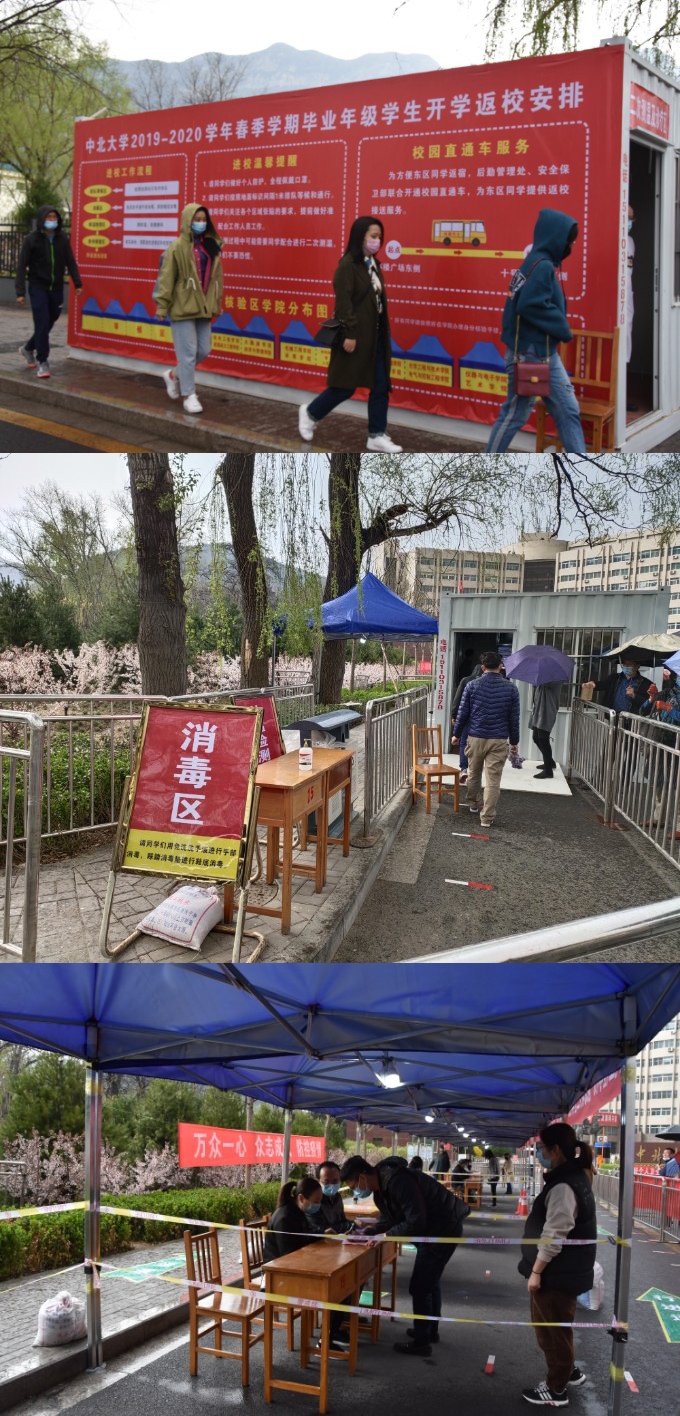 毕业年级开学报到流程演练在校门口进行。演练现场,全体人员佩戴口罩,相关学院人员在各自报到点就位等待,安保人员负责维持秩序。演练从老师乘车出发去接站开始,“学生”到达学校后,由工作人员引导有序排队等候,逐一通过消毒区、体温测验区(测体温、核验健康码)、身份核验区后,领取进校进宿证和在校指南,持证进校,统一组织分流回宿舍。校医院医护人员、消杀人员现场随时待命。