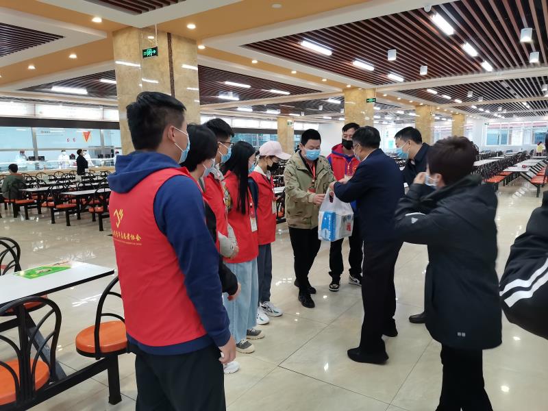 在学生餐厅,薛副书记亲切慰问志愿者,详细地询问了志愿者在返校后的学习与生活、志愿服务工作、具体岗位任务、餐厅人流量变化等情况,向他们为疫情防控工作付出的努力表示感谢。他表示,感谢大家在防疫攻坚战的特殊时刻积极参加学校的疫情防控工作,承担起青年的应有责任,同时也相信这段特殊的志愿服务经历一定会给大家的大学时光留下浓墨重彩的一笔。薛副书记为志愿者送上手套、口罩、消毒液等防护物资并嘱咐大家一定要注意做好自身防护,在保证自己安全的前提下,尽职尽责做好志愿服务,让青春在党和人民最需要的地方绽放绚丽之花。