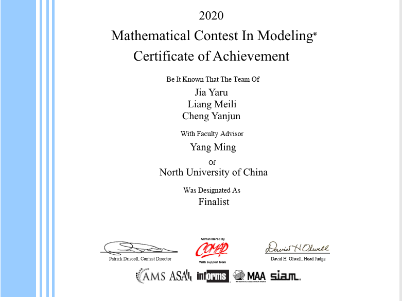 据了解,受疫情影响,本届比赛于2月13日至17日、3月5日至9日分两次进行。来自全球20多个国家和地区1488所高校的20948支队伍参赛。我校共有96支队伍参加了此次比赛。除获得SIAM奖、AMS奖和特等奖外,我校经济与管理学院贾雅茹、梁美丽、程艳君三位同学组成的参赛队(指导老师:理学院数学系杨明)获得特等奖提名(Finalist简称“F奖”),同时我校还获得一等奖(Meritorious Winner)3项和二等奖(Honorable Mention)18项,比赛成绩在山西省名列前茅。