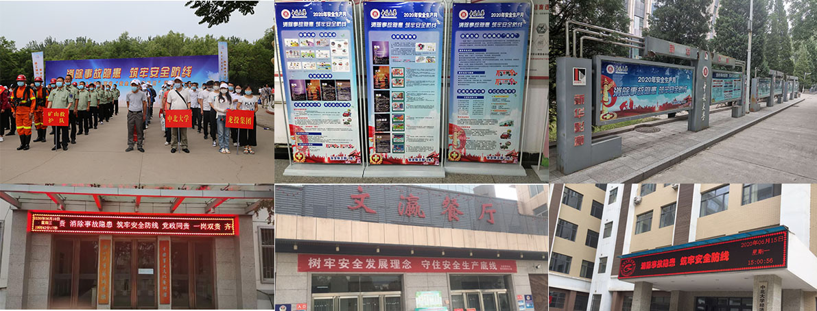 6月初,60余条安全宣传条幅陆续张贴悬挂在校园人员流动量较大的各个场所和道路两侧,10余块户外电子屏循环播放安全警示、安全提示,10余块主题宣传专栏展示在中央大道旁,“中北安保”公众号、职工QQ群、微信群陆续推送安全防范知识,各单位利用腾讯会议和线上收看大学消防公开课、“安全生产大家谈”云课堂、观看事故警示教育片、参加“安全生产月”网络知识竞赛等方式,组织师生开展安全知识教育培训。多种宣传手段的应用,拓展了宣传形式,引深了安全教育效果,有力营造了“关注安全、关爱生命”的校园安全宣传教育氛围。