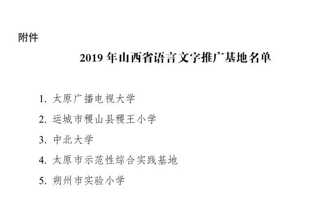 为落实《国家语言文字事业“十三五”发展规划》,教育部国家语委于2019年组织开展了首批国家语言文字推广基地遴选建设工作。省语委也相应组织开展相关工作。我校积极申报,在各市、高校及相关厅局推荐基础上,经专家评审、实地考察、综合评议等程序,最终成功入选山西省语言文字推广基地。