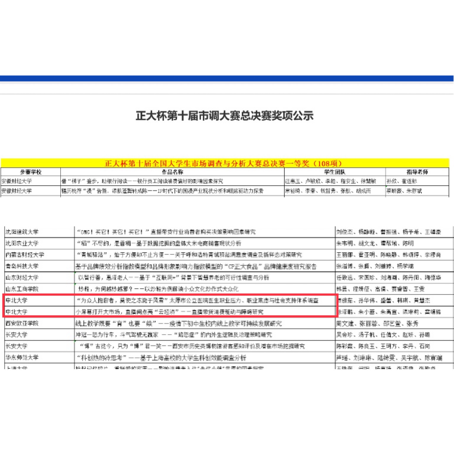 近日,教育部高等学校统计学类专业教学指导委员会与中国商业统计学会共同主办的“正大杯”第十届全国大学生市场调查与分析大赛全国总决赛结果公布,由武跃丽和王永琴、李向荣和刘志坚老师指导的2项作品,经山西省选拔赛推荐(全省共三项),双双夺得国赛一等奖。2项作品取题分别是“‘为众人抱薪者,莫使之冻毙于风雪’太原市公立医院职业压力、职业焦虑与社会支持体系调查” “小屏幕打开大市场,直播间点亮‘云经济’——直播带货消费驱动与障碍研究”。今年我校参加省赛的13项作品,有7项获省赛一等奖,4项获省赛二等奖,三等奖2项,推荐国家三等奖6项。