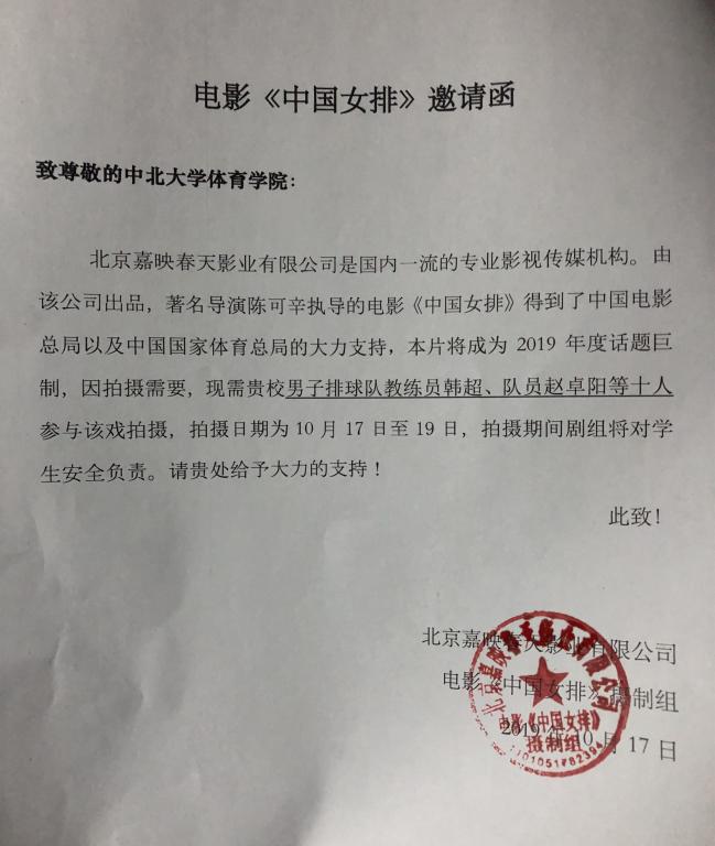 2019年10月17日,我校体育学院收到来自北京嘉映春天影业有限公司和电影《中国女排》摄制组的联名邀请信。信中表明,因拍摄需要,邀请我校男子排球队参与电影拍摄,拍摄时间为10月17日-19日。10月17日,我校男排队员在教练韩超的带领下即刻从学校出发,集体前往北京参加拍摄。