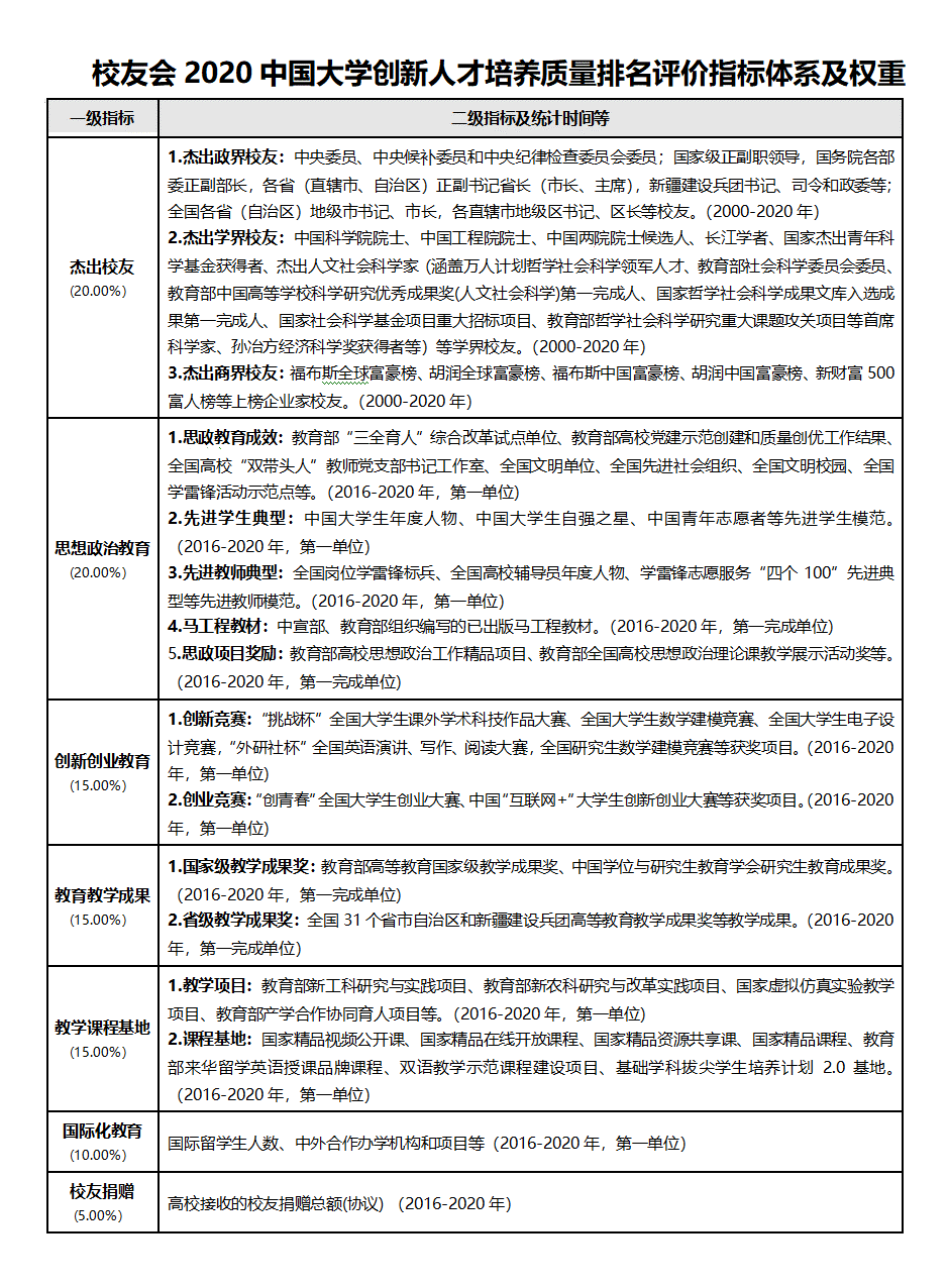 据悉,该评价指标数据来自艾瑞深研究院独家研发的中国高等学校发展指数数据库(CHDID),均是来自国家权威部门、第三方权威机构、企事业单位、新闻媒体、高等院校等对外公开的权威数据与客观数据。艾瑞深校友会2020中国大学创新人才培养质量排名评价体系由杰出校友(占比20%)、思想政治教育(占比20%)、创新创业教育(占比15%)、教育教学成果(占比15%)、教学项目课程基地(占比15%)、国际化教育(占比10%)、校友捐赠(占比5%)等7大一级指标组成。评价体系涵盖近100项体现中国大学立德树人成效、拔尖创新人才培养水平的高端评价指标,旨在体现2016-2020年中国高校拔尖创新人才培养质量与教育教学水平。