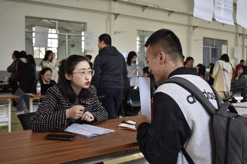 双选会现场人头攒动,应聘者不时驻足观看招聘单位的职位要求,询问相关信息。值得注意的是,受疫情影响,此次招聘会采用线上线下相结合的方式进行,求职者可以在现场投递纸质简历,未能到场的求职者也可以通过互联网、新兴的H5、微信二维码扫一扫等报名方式参与招聘,极大地帮助应聘者与用人单位提高了招聘效率。