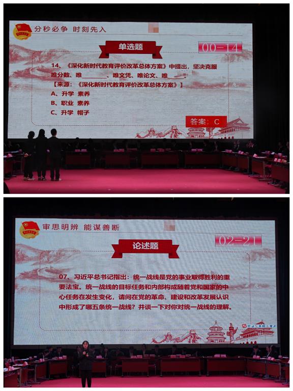 在激情高昂的团歌齐声高唱后,由校NHC音乐社刘嘉雄等同学共同演唱的80周年校庆主题歌曲《泰斗》,迅速点燃了现场观众的激情,大赛也正式拉开帷幕。决赛以团体现场知识竞答的形式分层次依序开展,分为必答题、计时答题、论述题三个环节。必答题环节,各代表队队员之间密切配合,答题迅速;附加题环节,各参赛队员更是眼疾手快,争分夺秒,你追我赶毫不相让;计时答题环节,各参赛队员思维活跃,沉着应答;论述题环节,各代表队主力选手持续发力,逻辑清晰、表达流畅、答题准确。比赛中,选手们准备充分、准确率高,对相关历史事件和时政知识信手拈来,充分展现了中北学子的沉稳睿智、博学广识。