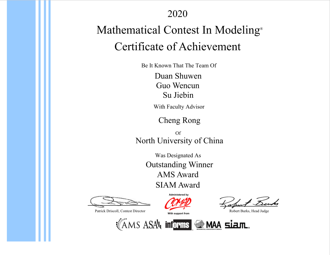在国际大学生数学建模竞赛中为山西省首获特等奖和AMS奖,并作为唯一国内高校问鼎最高奖项SIAM奖。荣获“墨子杯”第四届全国兵棋推演大赛编队赛总冠军,豪取四连冠。荣获全国大学生创新创业年会“优秀学术论文”奖,是山西唯一获奖项目。在第六届山西省“互联网+”大学生创新创业大赛中金奖及奖牌总数居全省首位。