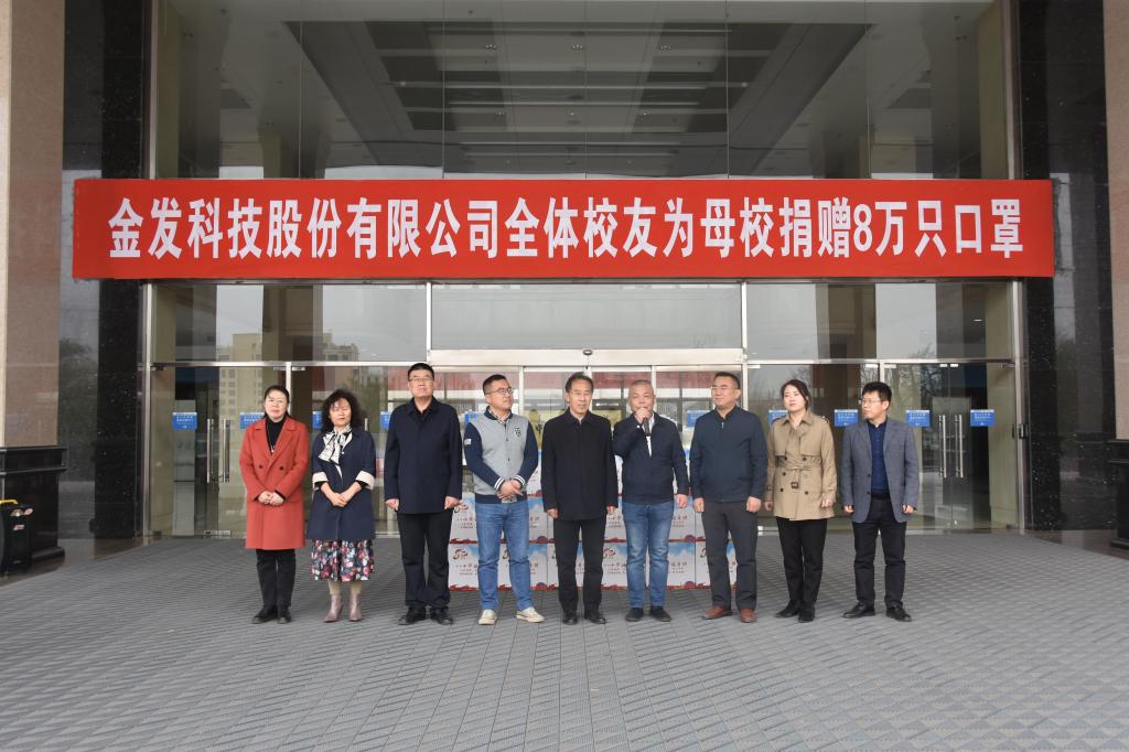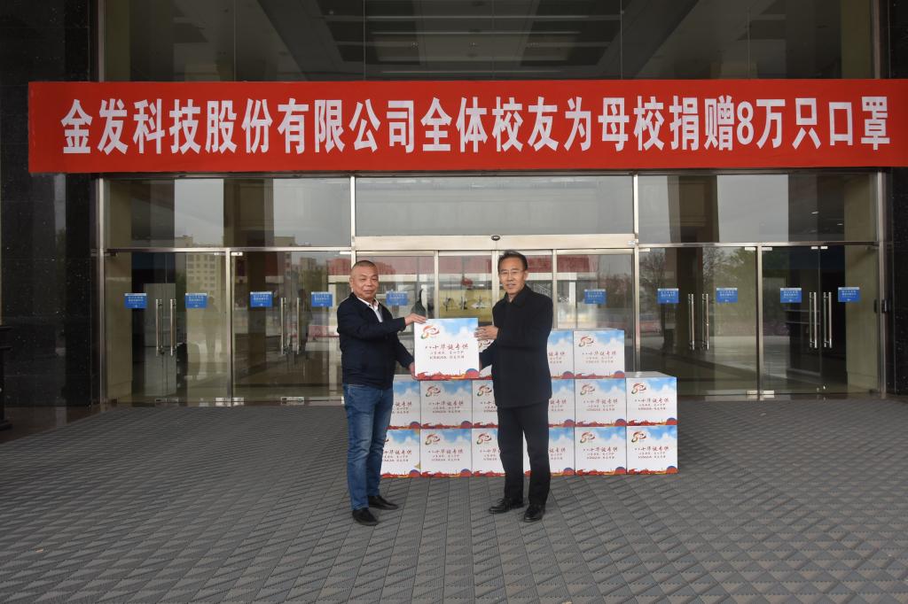 80周年校庆来临之际,金发科技股份有限公司54名中北校友向母校捐赠校庆专属定制一次性医用口罩8万只,表达对于母校的深厚情感。4月15日,上海校友会副会长周圣斌及办公室副主任王海涛代表金发科技全体校友来校捐赠,副校长苏铁熊代表学校接受捐赠并向校友们表示感谢。