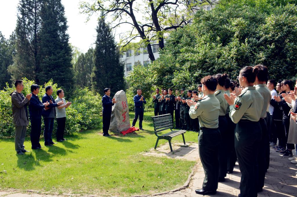 建校80周年华诞之际,2020级全体教官和在校退役大学生士兵为母校捐建“强军”石碑,引导广大师生树立国防意识,增强国防观念。 5月10日上午,石碑揭牌仪式在“将军林”举行。校党委副书记雷锋斌为“强军”石碑揭牌并致辞。