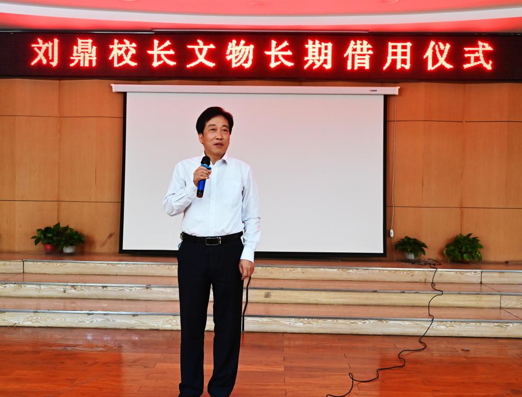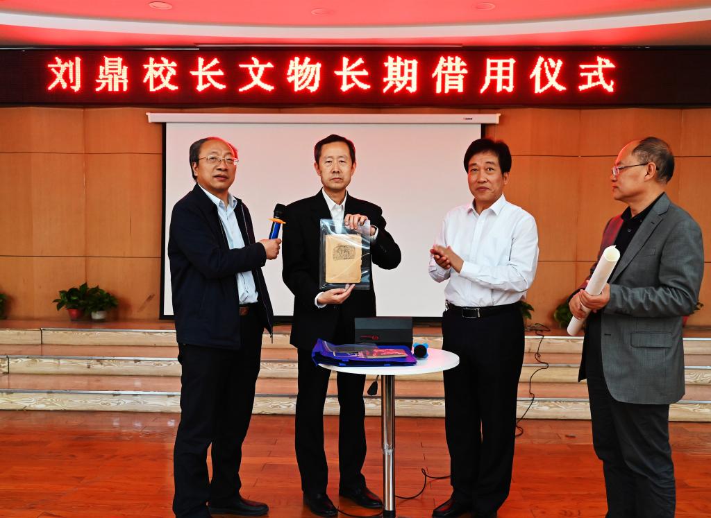 文物诉说历史、历史传承精神。5月18日,喜迎建校80周年之际,我校首任校长刘鼎之子刘文石来校,无偿捐献父亲生前使用的数件文物,供学校长期使用。长期借用仪式在艺术学院演播厅举行。此次捐献文物包括习仲勋亲笔题词、刘鼎校长曾在许多重大的场合穿过的一件中山装、使用多年的钱夹及一张民国时期的旧钞票、早年的学习和工作笔记、一只日常使用的餐勺、抗大校徽及一些重要会议的相关证件等。校党委副书记雷锋斌代表学校接受文物捐赠。图书馆(档案馆)、机电工程学院负责人及党委宣传部相关人员参加了仪式。党委宣传部部长薛实军主持仪式。