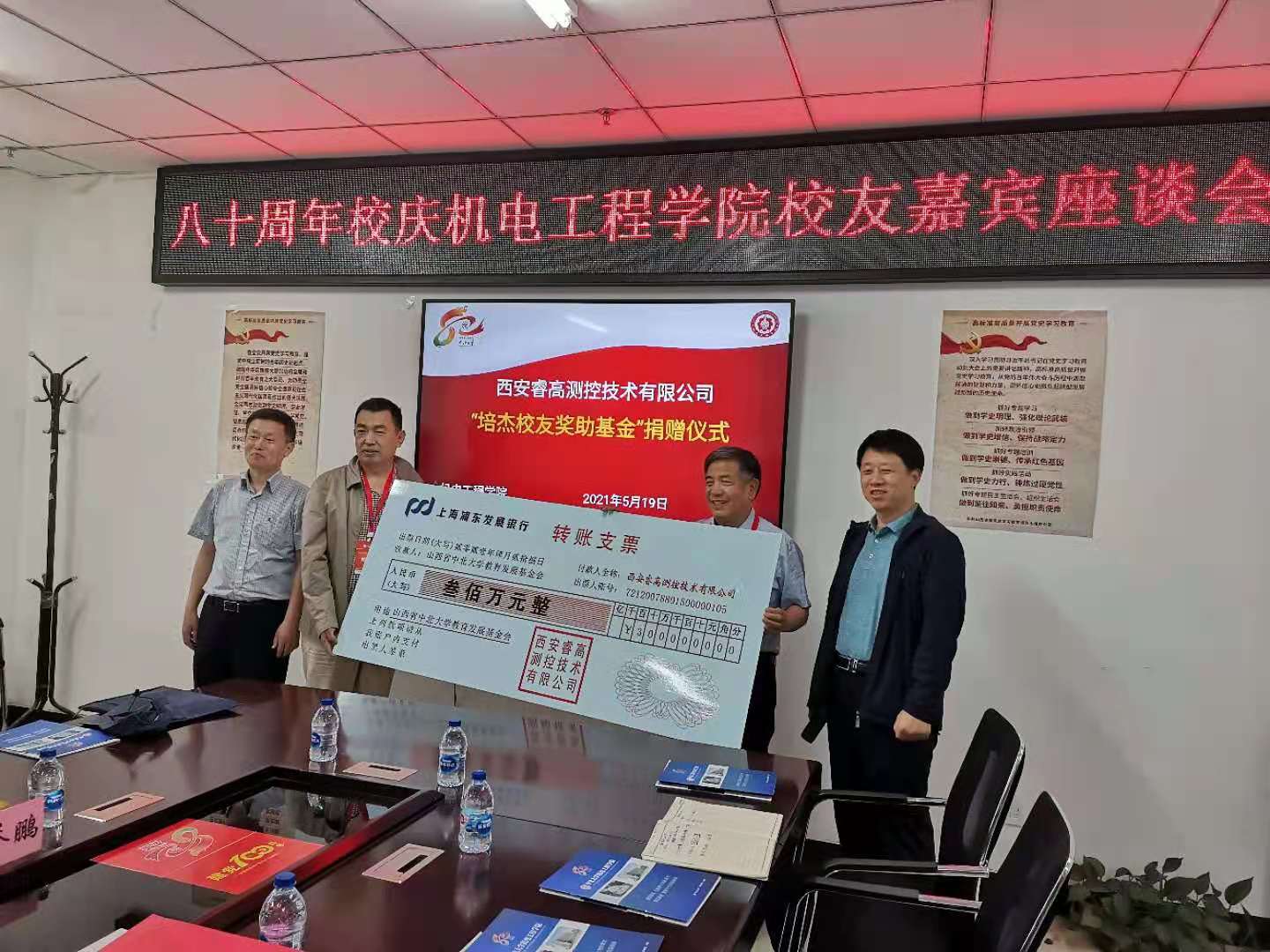 5月19日下午,机电工程学院校友企业捐赠仪式在学院会议室举行。西安昆仑工业(集团)有限责任公司党委书记、董事长刘亚北代表集团向学院捐赠了30-4航炮一门,睿高测控技术有限公司董事长付培杰代表集团向学院捐赠“培杰校友奖助基金”300万元,舜华电气有限公司总经理陈士博向学院捐赠“楷木九如意”摆件一副,西安沣舟航天技术有限公司总经理方举鹏代表西安沣舟向学院捐赠超音速靶弹一枚。4位校友同时对母校80华诞表达美好祝福。