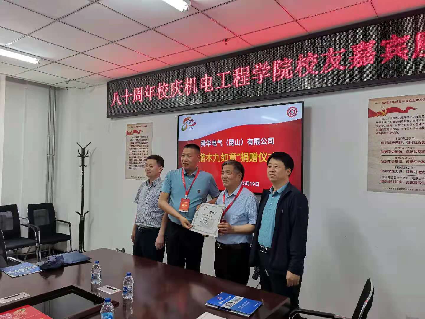 校庆期间,机电工程学院校友以多种方式表达了对学校和学院的祝福。其中,马为民为学院捐赠“秋韵”图一幅,张家富为学院捐赠掐丝珐琅一件,00013B1班、00014B1班为学院捐赠“闻道处”纪念石一块等。