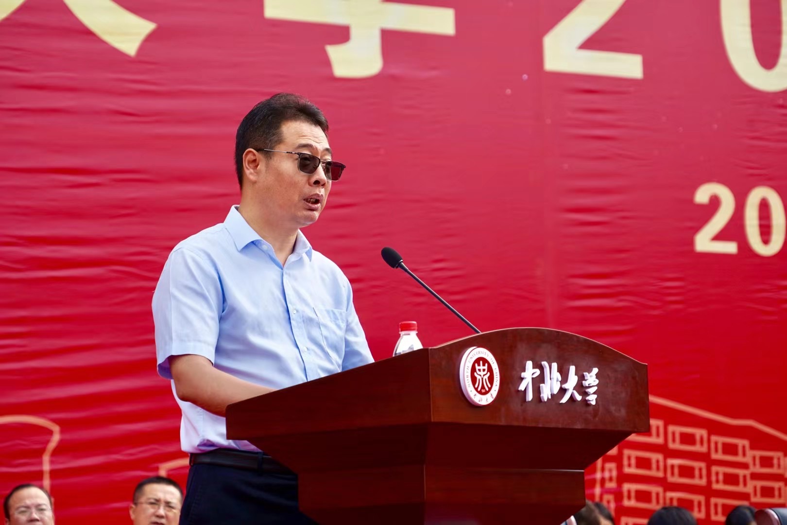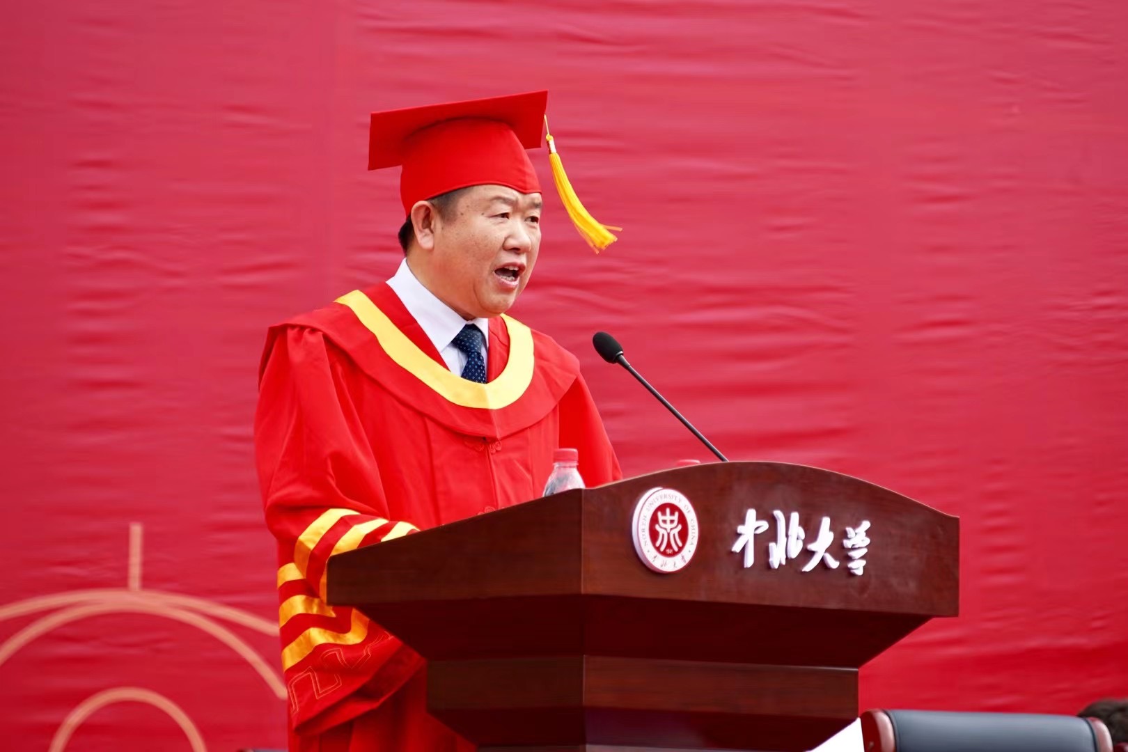 沈兴全代表全校师生员工、代表熊继军校长,向顺利完成学业的毕业生表示热烈祝贺,向精心培育同学们的老师及默默付出的教职员工表示衷心感谢,也向因为疫情不能现场参加典礼的毕业生同学致以亲切问候!他总结了学校在全体师生共同努力下取得的突出办学成就,向本届毕业生在四年学习、比赛、实践、服务西部等方面取得的优秀成绩、为学校争得的荣誉点赞。他表示,今年的毕业季正值中国共产党成立百年,又恰逢学校建校八十周年。希望大家能够在百年党史中感悟真理伟力,汲取智慧力量,学史明理、学史增信、学史崇德、学史力行,放飞人生梦想,开启事业华章。“汇入江海,涓滴才能永不干涸;融入时代,人生自有无限精彩。”临别之际,他向全体毕业生送上四个嘱托:一是坚定执着传承红色基因。希望同学们能坚持从红色精神谱系中立心铸魂、锤炼品格,始终做坚定的爱国者,让“人民兵工第一校”旗帜永远高高飘扬。二是坚守自立自强的创新意识。希望同学们能够勇担时代使命,追求卓越、迎难而上,以中北人的气度、情怀和品格续写璀璨的人生新篇章。三是秉承坚韧不拔的奋斗精神。希望同学们能够秉承奋斗精神,保持进取姿态,只争朝夕、不负韶华,用奋斗致敬青春,用奋斗赢得未来。四是保持笑对人生的阳光心态。希望同学们漫漫人生路上无论面对多少困难和阻碍,一定要坚信,“阳光总在风雨后”,只要不抛弃、不放弃,一定能“在危机中育新机、于变局中开新局”,勇敢逆风飞翔,迎来“柳暗花明又一村”。最后,沈兴全希望同学们带着母校的嘱托,带着梦想和希望,勇敢出发,以永不懈怠的精神状态和一往无前的奋斗姿态,勇立潮头、奋勇搏击,肩负起历史赋予的伟大使命,创造无愧于时代、无愧于青春的新成绩!