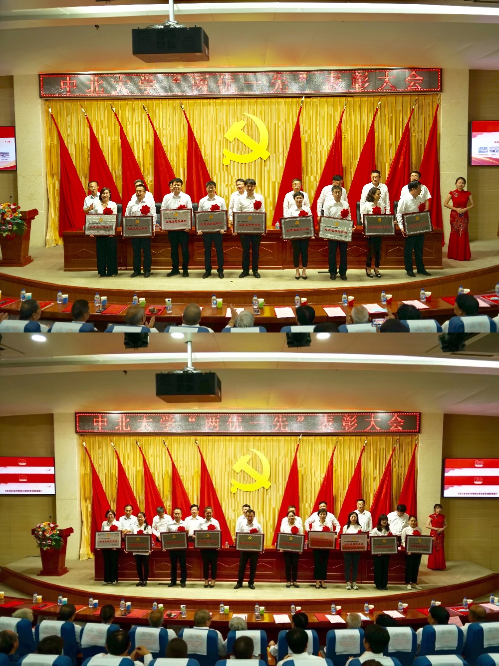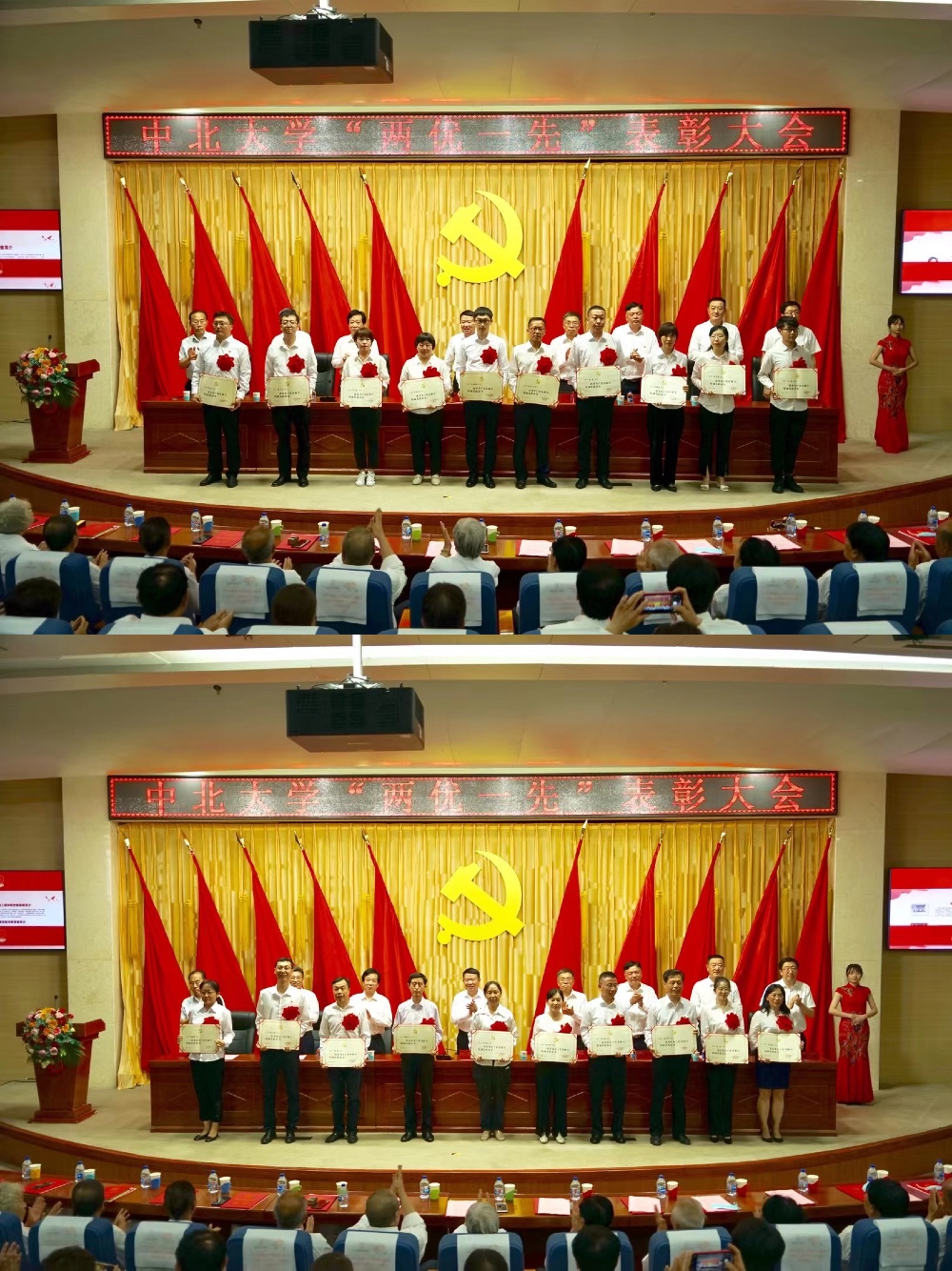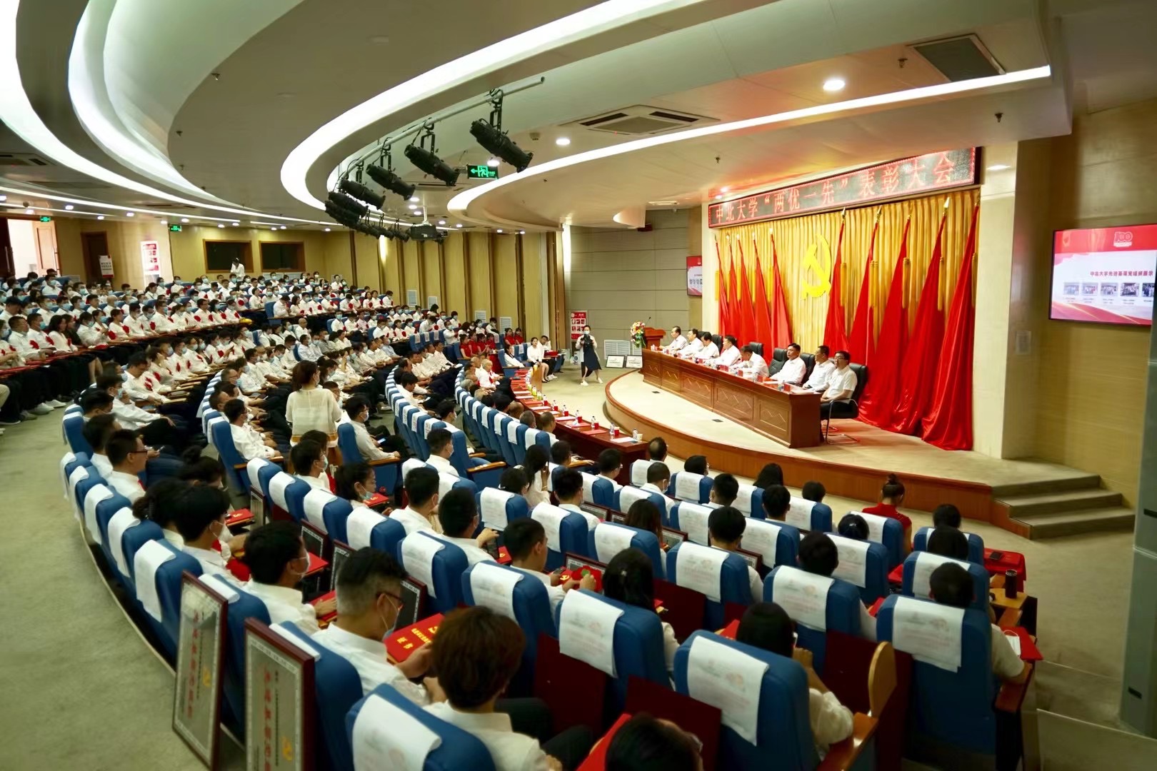 大会在庄严的国歌声中开始。校党委副书记雷锋斌首先宣读了《中共中北大学委员会关于表彰全校优秀共产党员、优秀党务工作者和先进基层党组织的决定》。于瑞恩等100名共产党员荣获“全校优秀共产党员”称号;于晶等100名党务工作者荣获“全校优秀党务工作者”称号;机电工程学院党委等100个基层党组织荣获“全校先进基层党组织”称号。