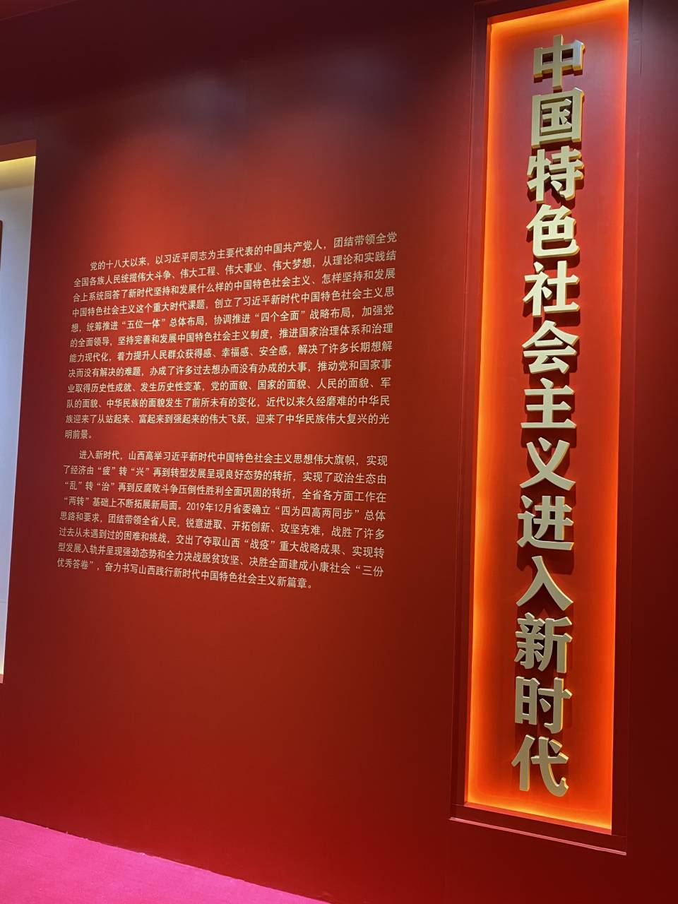 山西省庆祝中国共产党成立100周年图片展以“不忘初心、牢记使命”为主题,通过“牢记嘱托”“新民主主义革命时期”“社会主义革命和建设时期”“改革开放新时期”“中国特色社会主义进入新时代”五个部分780余张图片、图表,系统全面、权威准确地呈现了党领导山西人民砥砺奋进的光辉历程、重大成就和宝贵经验。其中有毛泽东亲笔题写的“晋察冀边区抗日模范根据地”书名手稿,习近平总书记视察山西时的珍贵照片,老一辈无产阶级革命家在山西开展革命斗争的历史影像,不同历史时期山西党组织情况介绍,刘胡兰烈士英勇就义的油画,右玉县委书记的先进典型群像,山西第一个开发区、第一条双线电气化重载运煤专线、第一条高速公路等多个“山西第一”,山西资源型经济转型发展历程,山西省国民经济和社会发展第十四个五年规划和2035年远景目标纲要……一幅幅图片、一组组数据、一张张图表、一块块展板,串联起中国共产党在山西百年奋斗的峥嵘岁月,集中展示了党领导山西人民进行社会主义革命、建设、改革的巨大成就,全景式展现了三晋大地发生的沧桑巨变。