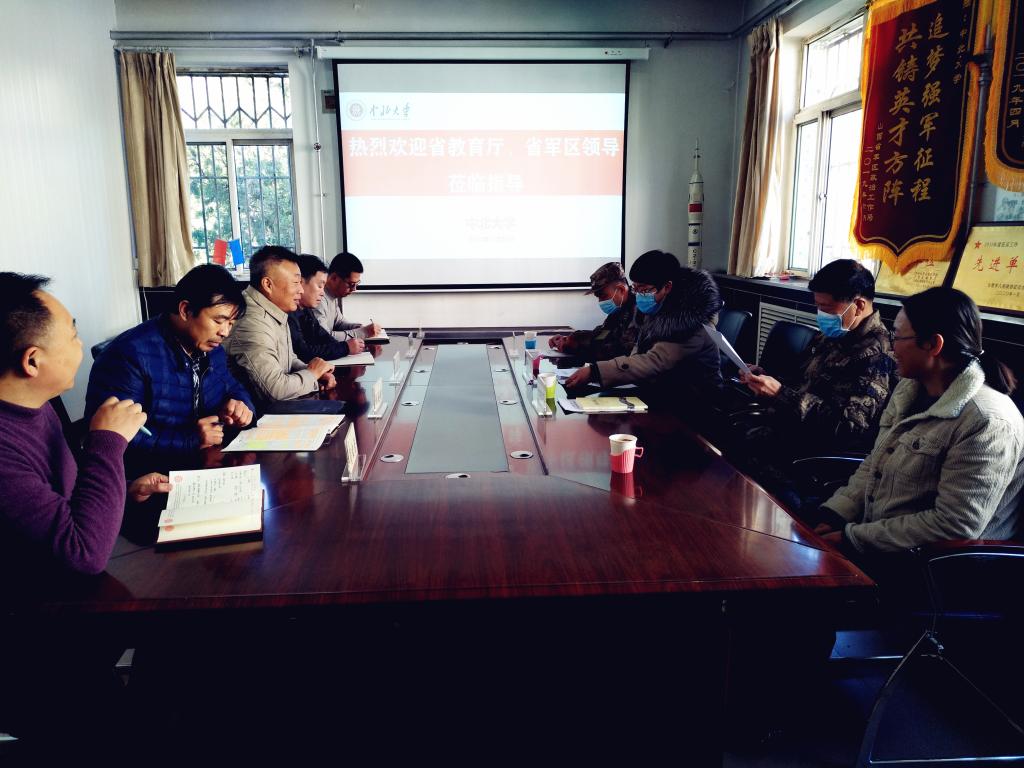 11月10日,省教育厅体卫处副处长周洁、省军区战备建设局杨慧上校、省国防教育办主任张培荣一行来校,就军训协同创新基地筹建工作进行调研指导。