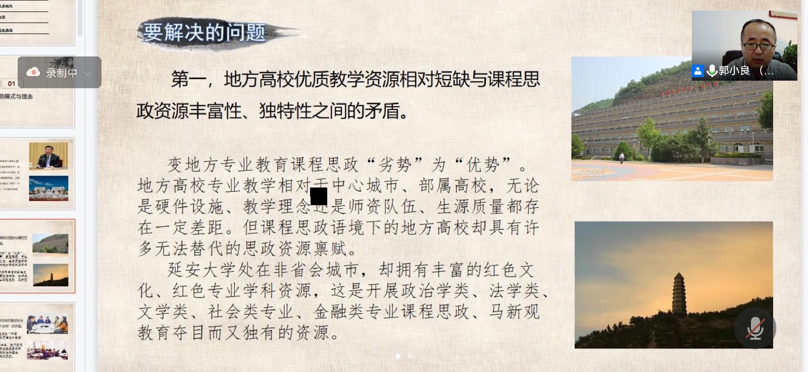 作为教育部课程思政示范课程《陕甘宁边区新闻事业——走进红色新闻历史现场》负责人、课程思政教学名师,郭小良以《地方高校课程思政四轮驱动模式的构建与实践》为题,结合延安大学课程思政建设经验,介绍了以地方红色文化资源为支撑的内容体系、以师德师风建设为支撑的教师培养体系、以课程实践育人为支撑的实践体系和以过程考核为主的评价体系。他建议,地方高校要充分挖掘特色,发挥比较优势,因校制宜、因地制宜、因课制宜,打造课程思政特色品牌课程。