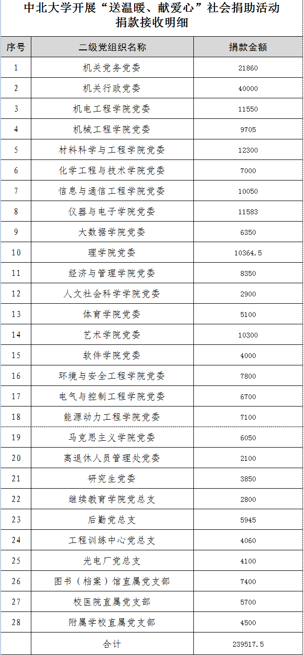 为贯彻落实中共山西省委办公厅、山西省人民政府办公厅《关于开展“送温暖、献爱心”社会捐助活动的通知》精神,扎实开展好“我为群众办实事”实践活动,学校精心组织开展了“送温暖、献爱心”社会捐助活动。全校党员干部、教职员工踊跃参与,共为困难群众捐款239517.5元,募集的善款将由民政部门第一时间交送到困难群众手中,切实帮助困难群众特别是近期受灾群众渡过难关。