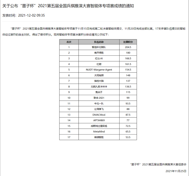12月8日-12日,由中国指挥与控制学会主办、智能博弈与兵棋推演专委会等单位承办、我校协办的“墨子杯”2021第五届全国兵棋推演大赛总决赛在线上举行。本届大赛分主体编队赛、智能(AI)博弈赛两大赛项。来自12个省赛区、200多所院校和科研院所、企事业单位的2267支队伍参加了主体编队赛,其中170支优胜队伍入围总决赛;智能博弈赛共有17支队伍参加。我校由涂坤海、陈一波、何骏贤组成的“光复队”斩获编队赛总冠军。同时,由王利锋、王国岩、林梓明、冯俊淇组成的“智信中北联队”为我校首获智能博弈赛冠军。这是我校学子在该赛事连续五年折桂,今年又将智能博弈赛冠军收入囊中,为学校再添一份荣誉。