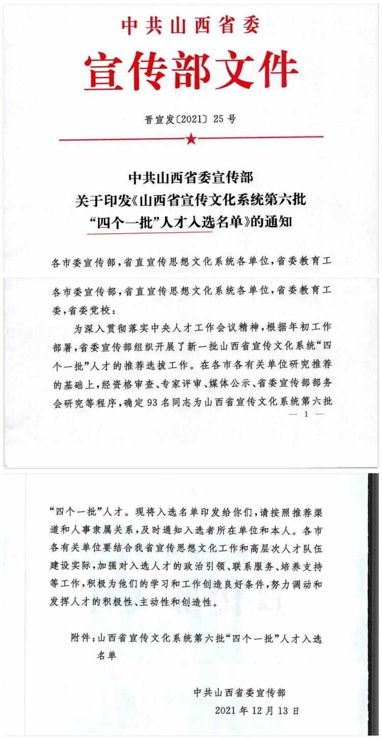 近日,省委宣传部公布山西省宣传文化系统第六批“四个一批”人才入选名单,我校马克思主义学院院长赵笑蕾教授入选山西省宣传文化系统第六批“四个一批”理论界人才。此前,我校艺术学院王燕平、陕军入选我省首批“四个一批”文艺界人才。