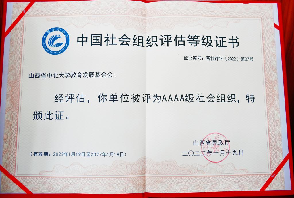 近日,山西省民政厅发文公布了2021年度山西省省直社会组织评估等级结果,我校教育发展基金会获评4A等级社会组织,并正式授予证书及牌匾,有效期限5年。
