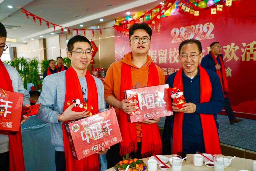 联欢会上,校领导还为留校学生送上新年爱心礼包和春节大礼包,并与同学们合影留念。李延昊同学代表所有寒假留校学生真诚感谢学校领导及老师们的关怀关爱,并为全体老师送上新春祝愿。表示一定要把学校的这份关心化为努力向上的动力,进一步树立远大理想,珍惜青春韶华,更加努力学习,以更好的成绩回报学校和社会。
